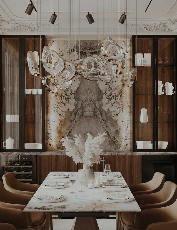 Ар-деко, бюджет 24,4 млн руб. Кварцит Patagonia, мрамор Bronze Fantasy, SmartGlass